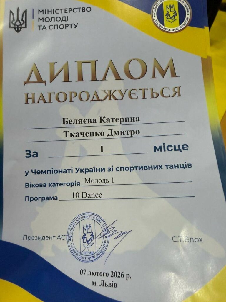 Дмитро Ткаченко і Катерина Беляєва посіли перше місце на Чемпіонаті України зі спортивного бального танцю у категорії Молодь 1 з 10 танців.