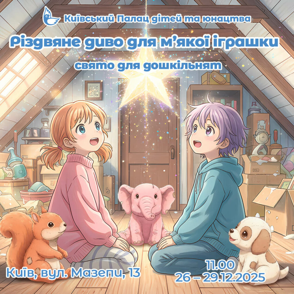 Запрошуємо дітей і батьків до Київського Палацу дітей та юнацтва на новорічне шоу, сповнене магії, музики й доброго настрою! Коли: 17-23 грудня 2025 року о 13:0026-29 грудня 2025 року о 13:00Та 30 грудня об 11:00 Адреса: м. Київ, вул. Мазепи, 13, Київський Палац дітей та юнацтва(маємо власне укриття) Цього року казкові герої Палацики вирушають у […]